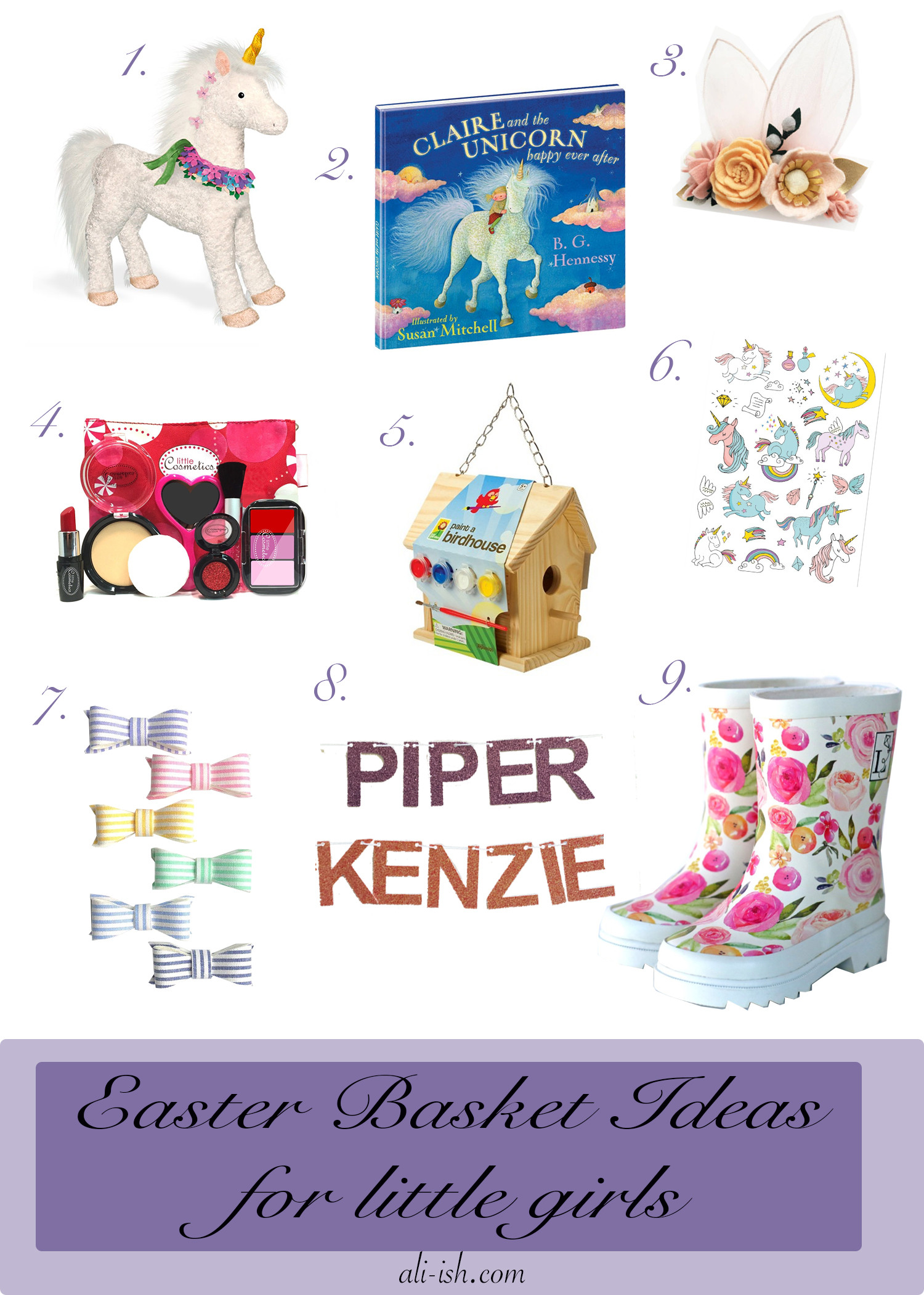 Like every holiday Easter is so much more fun with kids. This year I had the best time putting together Easter baskets for each of my girls. Like most 2 and 5-year-olds they are obsessed with unicorns, rainbows and all things that sparkle. I try not to go overboard on candy if I put any in at all, they will likely get more then they could consume from family (not complaining, I love Easter candy and will probably be the one to eat the majority of it). My rule of thumb for Easter Baskets for girls is; always include at least 1 book, a craft for them to do, a toy or 2, something for their hair (I have a slight bow addiction), and something practical that they need. I can’t wait for them to discover their baskets in the yard on April 1st!